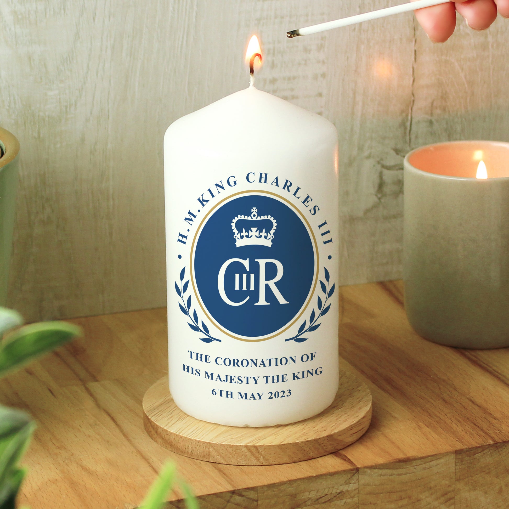 Personalised King Charles III Blue Crest Coronation Commemorative Pillar Candle