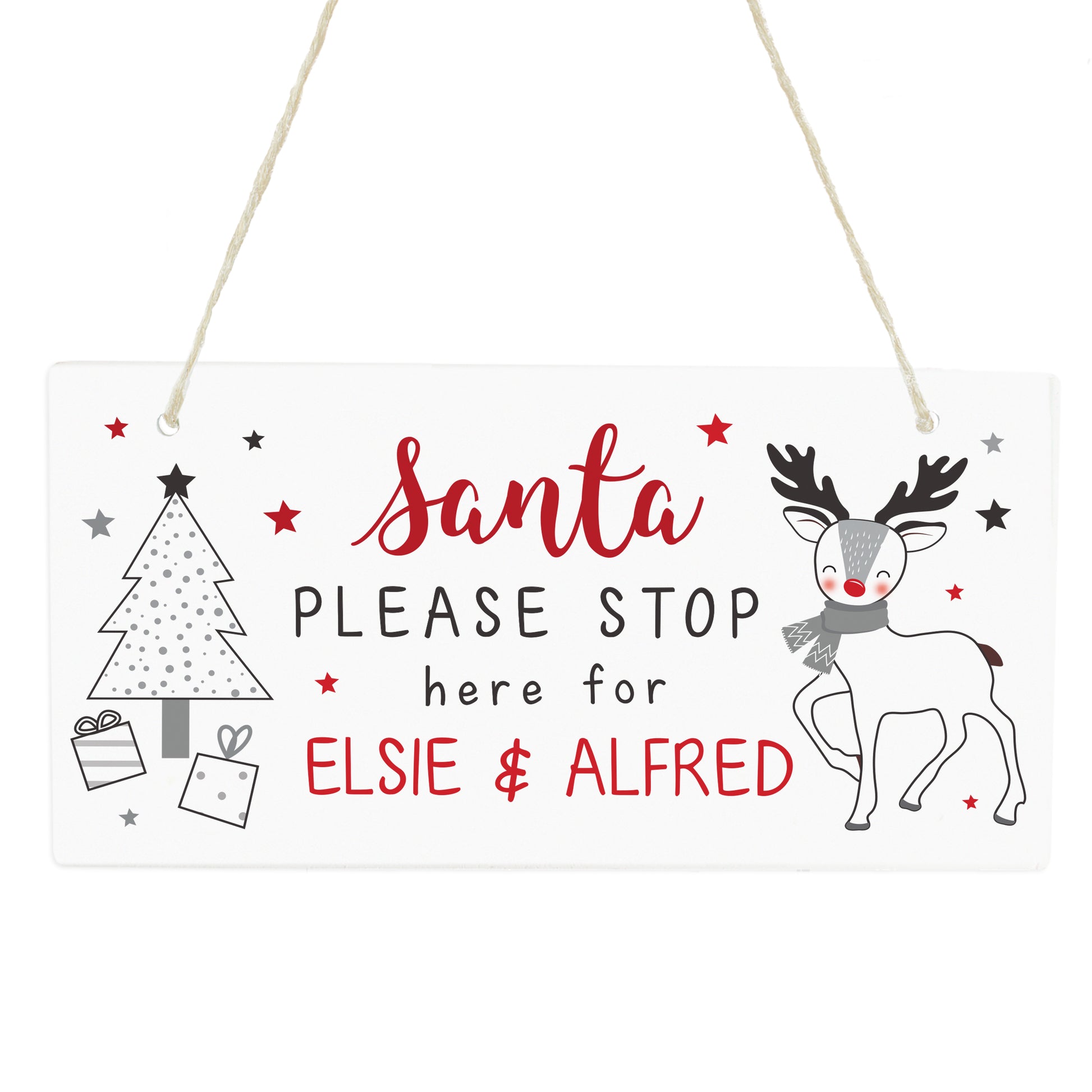 Our Personalised Rudolph Santa Please Stop Here Sign! This charming Christmas decoration is perfect for little ones who are eagerly awaiting Santa's arrival on Christmas Eve. The sign is made from wood and comes with a ribbon, making it easy to hang on a door or in a room. Just add your child's name to the sign and watch their face light up on Christmas morning!